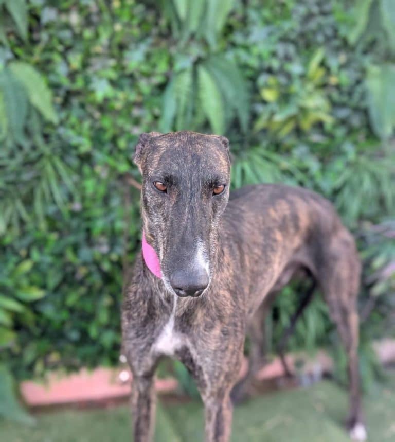 Chaplin es un galgo precioso de carácter muy noble, tranquilo y seguidor. Es inseguro cuando está con personas desconocidas no está en pánico pero es tímido y no se muestra alegre sino que prefiere quedarse en su cama u observar desde lejos cuando alguien que no conoce entra en su chenil. Aún así, es manejable, pasea bien, no está tremendamente asustado, sólo es el típico carácter de galgo inseguro y seguidor que necesita tiempo para adaptarse, y se muestra más confiado cuando está junto a otros perros.