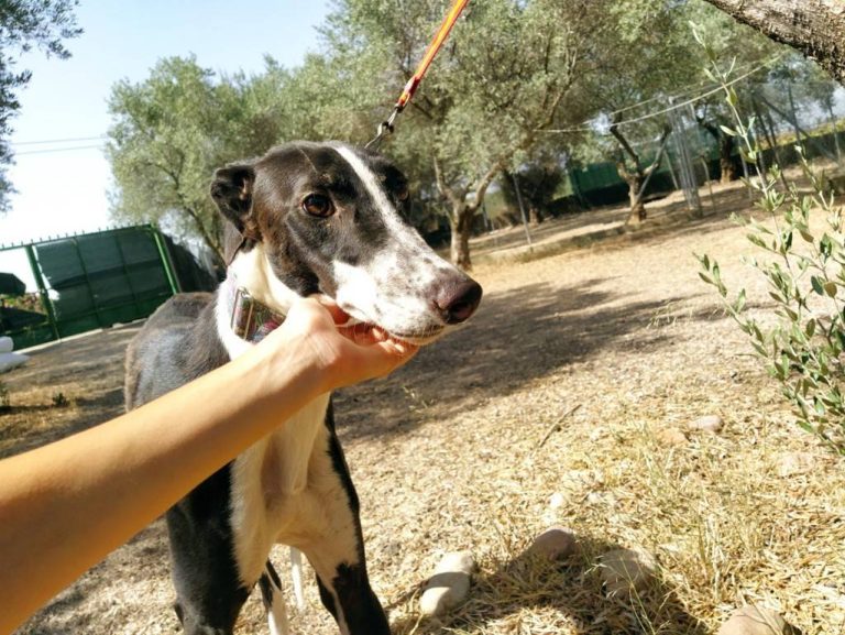 Es un galgo con un carácter muy simpático. Es bueno, noble, tierno y tranquilo, aunque también le gusta mucho jugar. Es muy dulce, un perro cariñoso y sin miedos, equilibrado. Es especialmente cariñoso, le gusta estar cerca de las personas y le encanta ponerse debajo de ti asomándose entre las piernas.