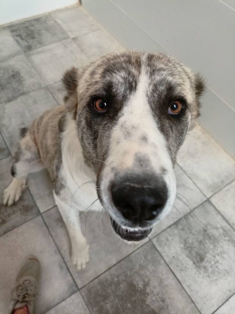 Julia es una grandullona que es un encanto, una perrita muy noble, boba, cariñosísima y buenaza. Sin miedo, te mueve el rabo muy contenta cuando alguien le dedica un minuto, dándote con su cabeza en tu mano para que le acaricies. Si te alejas te va siguiendo aunque no te conozca para que le des cariño, y con otros perros es muy buena y sumisa, nada dominante. Es una niña pequeña y noble en el cuerpo de una grandullona, y aunque es muy vaga también le gusta mucho jugar con otros perros. Muy fácil, apta para principiantes, no importa sola o con otros perros. A pesar de su tamaño no necesita grandes espacios para vivir, ya que se pasa el día durmiendo y es super tranquila.