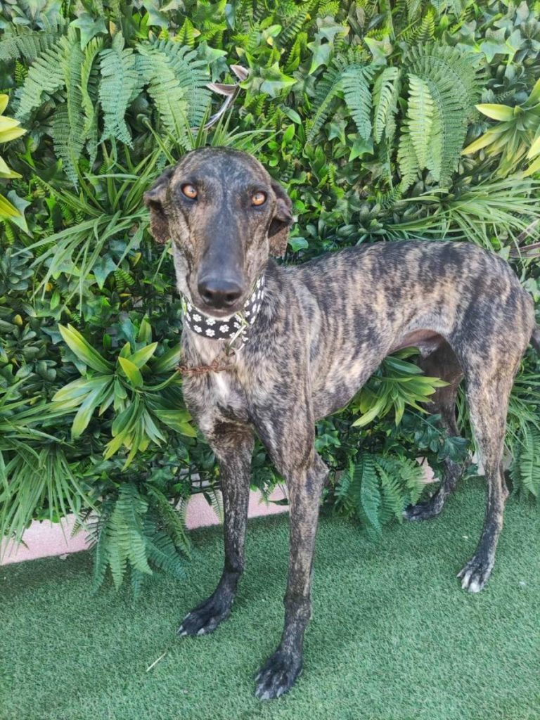 Espagueti es un perrete muy simpático, bueno y cariñoso. Es un galgo juguetón y feliz, no tiene miedos, se relaciona con todas las personas aunque nunca antes los haya visto. Es sociable y noble y activo, se puede poner de pie sobre dos patas para saludar y le gusta jugar con otros perros. En su relación con otros perros es simpático, sociable, aunque es bastante intenso y juguetón, con lo cual debe de ir con perros que aguanten esa energía que tiene, con otros perros juguetones no le importa que otros le golpeen jugando, él siempre está feliz. No es muy dominante pero no tolera a machos dominantes, no es agresivo pero no está cómodo con este tipo de perros. Para familias que busquen perro juguetón, activo y mejor con otros perros que toleren perros con cierta intensidad para que esté entretenido y no dominantes, o que la familia no pase mucho tiempo fuera de casa. Apto para principiantes con galgos.