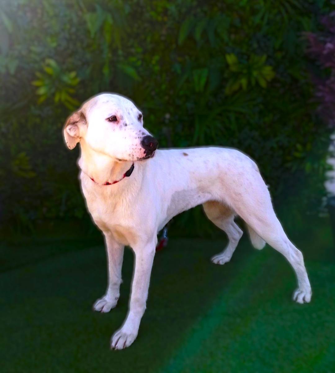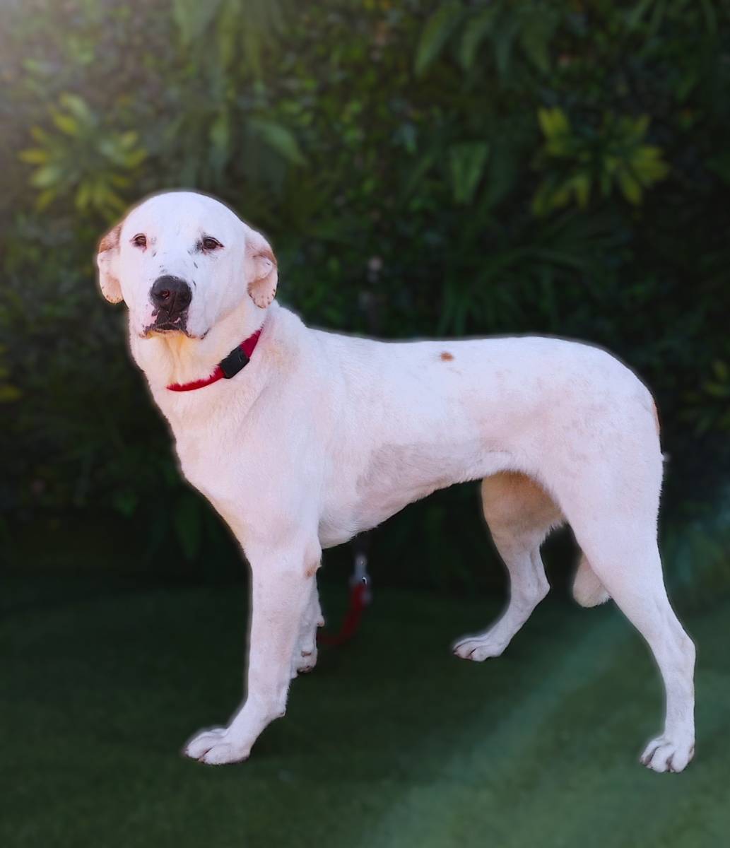 Tiene un carácter muy bueno, es simpática con cualquier persona, noble, muy linda y dócil. No tiene miedos, siempre se pone contenta cuando alguien entra en su parque aunque sea un desconocido, y espera sentada mirándonos detrás de las rejas de su puerta hasta que nos acercamos a darle una caricia. Es bastante tranquila la mayor parte del día, no ladra ni tiene ansiedad, pero a veces en el parque le gusta jugar con sus compañeros (aunque sólo unos minutos y después se tumba a descansar).