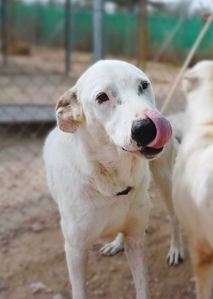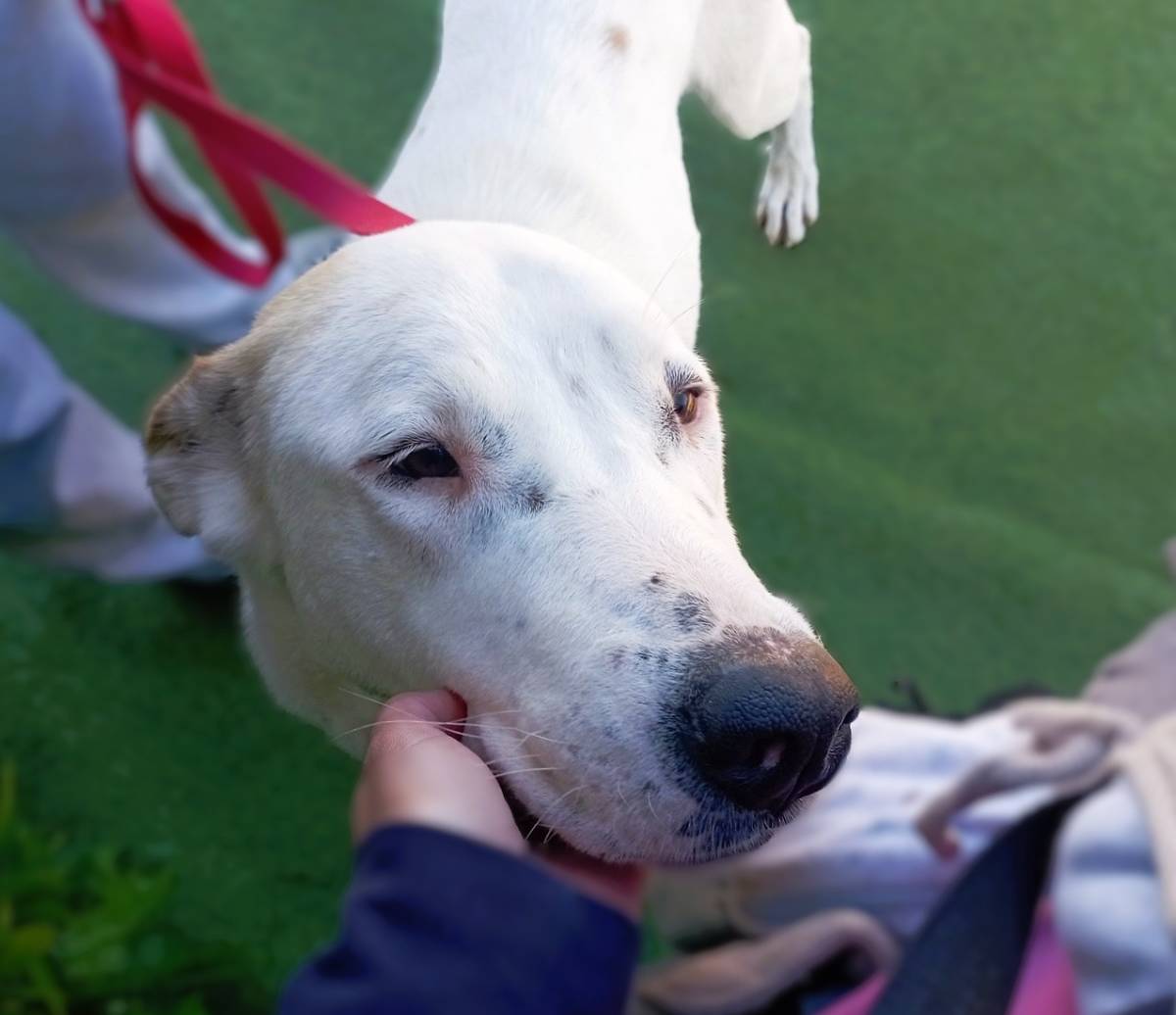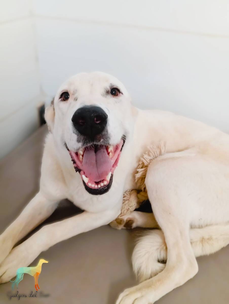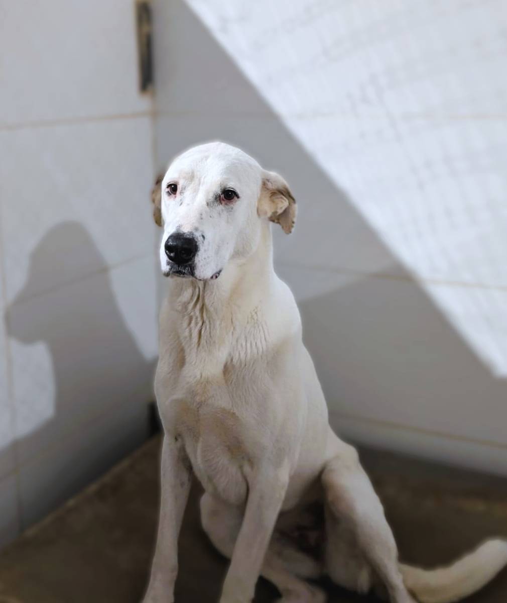 Estrella es sencillamente maravillosa. Es una perrita de tamaño grande tipo mastín que rescatamos de una horrible rehala en un pueblo de Córdoba. Su dueño tenía decenas de perros atados y encerrados conviviendo con los huesos de los cadáveres de otros perros que habían ido muriendo allí de hambre e inanición, y los que quedaban vivos se encontraban en estado de extrema delgadez y desnutrición.