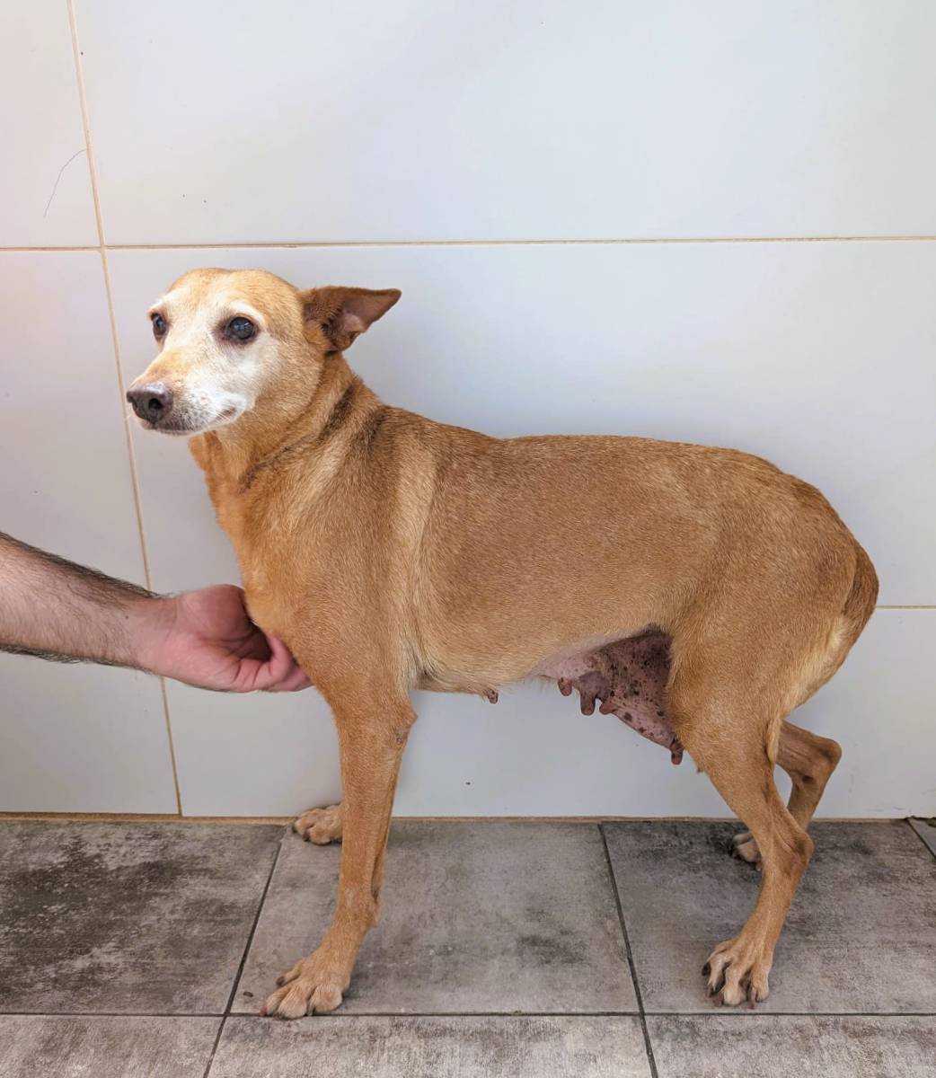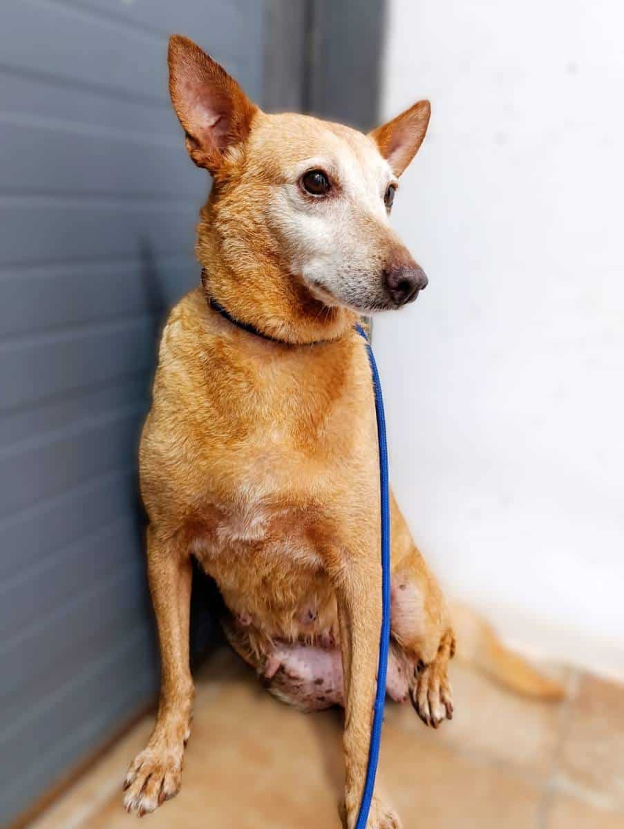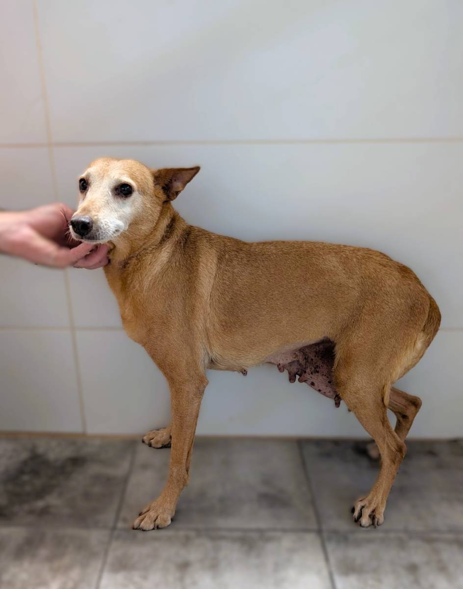Flor es una chiquitina que rescatamos de una rehala en situación muy grave. Pertenecía a un anciano que rescataba perros de cazadores y los mantenía en un cortijo derruído, creyendo darles una mejor vida que la que habían tenido antes. Cuando la rescatamos, tenía una gran hernia en su abdomen, resultado de tantos embarazos a los que la habían sometido forzosamente para comerciar entre cazadores con sus crías, y varios tumores en ambas líneas mamarias que hemos tenido que intervenir quirúrgicamente.