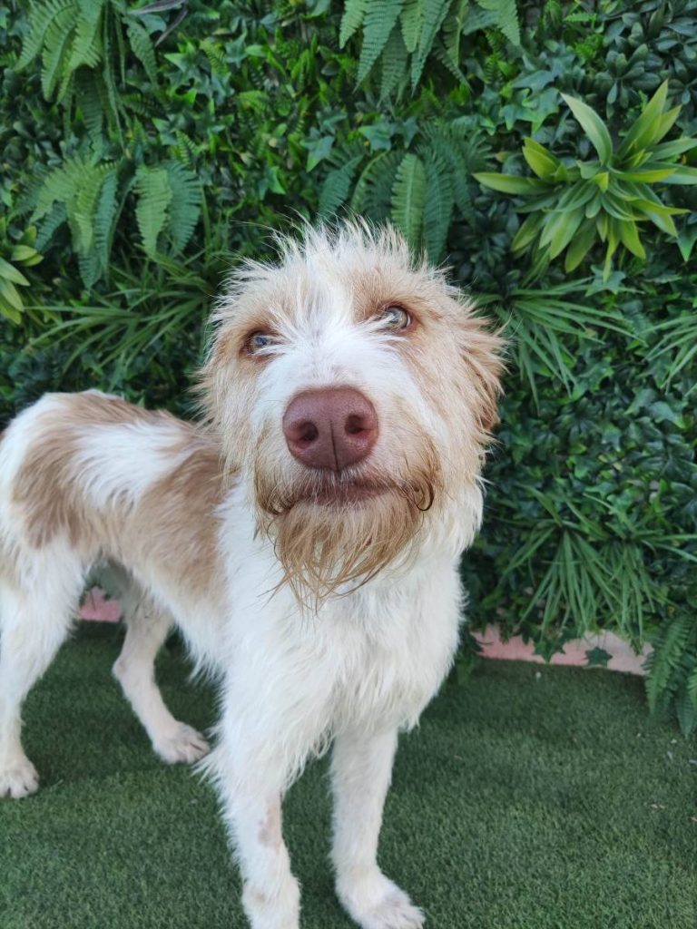 Es un perro feliz, cariñoso, simpático y sociable. No tiene miedos pero es un perro que no sabe lo que es la vida normal, ha estado toda su vida atado a una cadena de 50cm por lo que tiene que aprender a como comportarse, lo que puede y no puede hacer, a una vida más normalizada. Esto no será un problema para él, es un perro inteligente y que aprende y se adapta muy rápido. Se lleva bien con otros perros, no es dominante aunque si le gusta mucho jugar y puede ser un poco intenso. Es un perro fácil con el que hay que trabajar para enseñarle lo que es la vida normal, pero con un poco de paciencia y experiencia será un perro perfecto para convivir. Para familias que busquen un perro activo, mejor si tienen otro perro equilibrado que le ayude en la adaptación, pero también puede vivir solo.