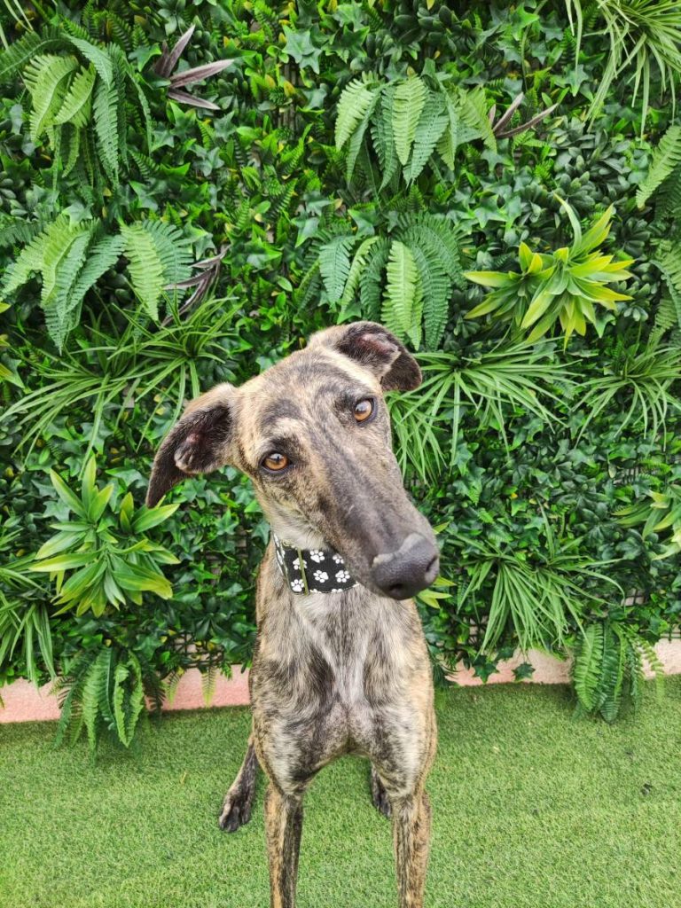 Olivia es una perrita muy linda, simpática, alegre y cariñosa. Tiene el típico carácter de una galga sociable joven, siempre feliz cuando alguien accede a su chenil, y muy sociable con otros perros (sumisa, no dominante y muy simpática). Sin embargo, cuando alguien desconocido la saca de su grupo y se ve sin otros perros alrededor, se muestra bastante más insegura y desconfiada, sin llegar a mostrarse con miedo pero ella se siente más segura cuando hay otros perros cerca. Así, mejor para familias que tengan otro perro, aunque en absoluto va a ser una galga miedosa, será juguetona e incluso activa en compañía de otro perro. Apta para principiantes con galgos, perra muy fácil para familias con otro/s perro/s
