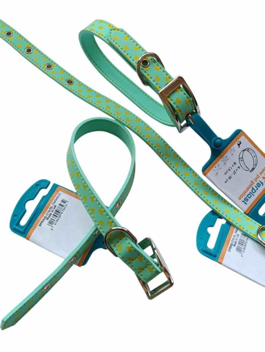 El material es impermeable, de fácil lavado y tiene un diseño muy bonito color verde agua con pequeños corazones, hebillas metálicas resistentes y ajustable desde 27 a 35 centímetros, ancho del collar 1’5cm.