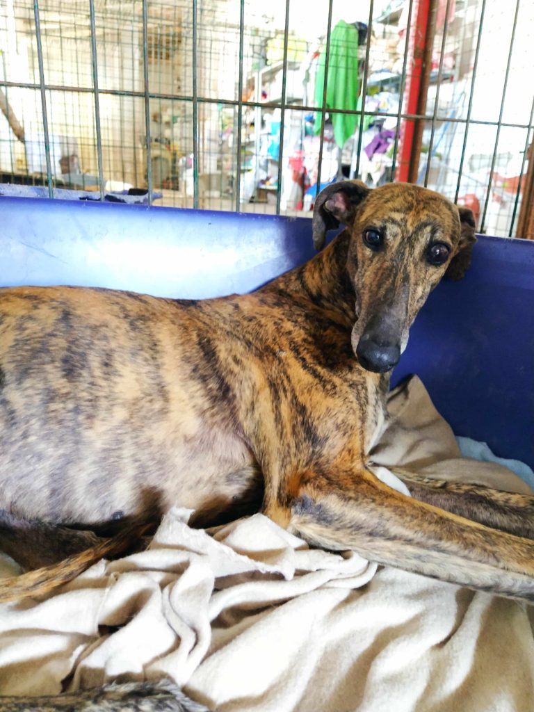 Al principio puede ser tímida pero es una galga muy tierna, tranquila, dulce y buena. Es sociable, sumisa con otros perros. Apta para principiantes.